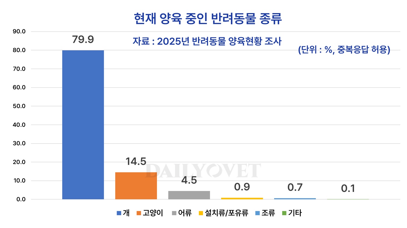 가장 많이 양육하는 반려동물은 개(79.9%)였고, 그 뒤를 고양이(14.5%), 어류(4.5%), 설치류/포유류(0.9%), 조류(0.7%) 등이 이었다. 반려견은 가구당 평균 1.11마리를 양육 중이었고, 반려묘는 가구당 1.27마리를 양육 중이었다.