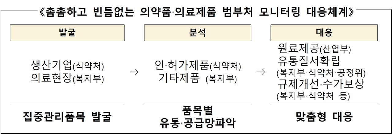 집중관리 품목의 선점 사재기 등이 발생하지 않도록 신고센터(심평원)를 운영하고 각 단체별 자율규제를 추진하는 동시에 위반행위 발생 시 정부가 즉시 개입하여 행정지도를 시행한다. 또한, 치료 재료의 경우 최근 환율 상승을 반영해 건강보험 수가를 상향 조정하여 의약계의 부담을 완화한다.