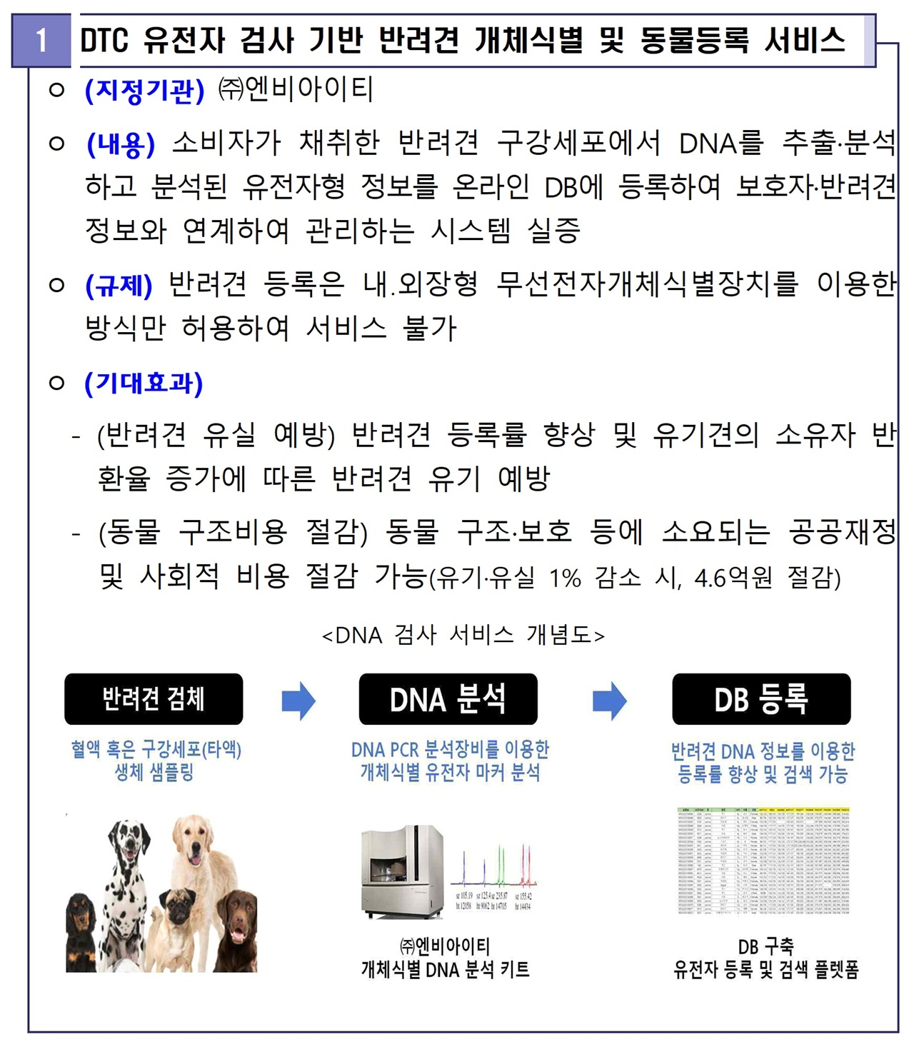 과학기술정보통신부(장관 배경훈)가 10일(금) 제58차 연구개발특구위원회에서 ‘소비자 직접 의뢰(DTC, Direct To Consumer) 유전자 검사 기반 반려견 개체식별 및 동물등록 서비스’의 규제샌드박스 실증 특례를 지정했다.