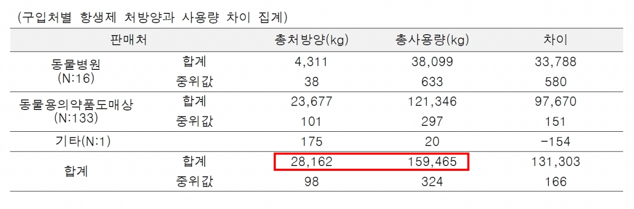 150개 농장 중 진료한 동물병원에서 곧장 항생제를 수급하는 16개소를 제외한 134개소 중에서 수의사에게 처방전을 받지 않거나, 받더라도 판매업소(동물용의약품도매상)에 전달하지 않는 농장은 102개소(76.1%)에 달했다.