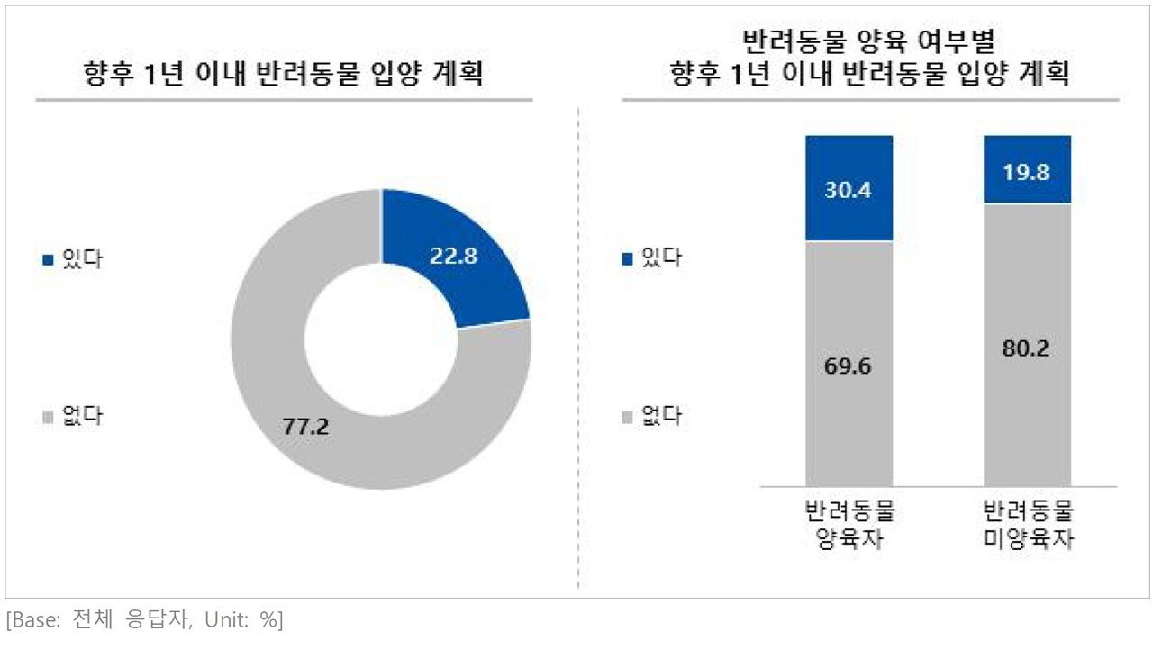 2025년 동물복지국민의식조사 결과, 우리나라 국민의 약 22.8%가 향후 1년 이내 반려동물 입양 계획이 있다고 답했다.