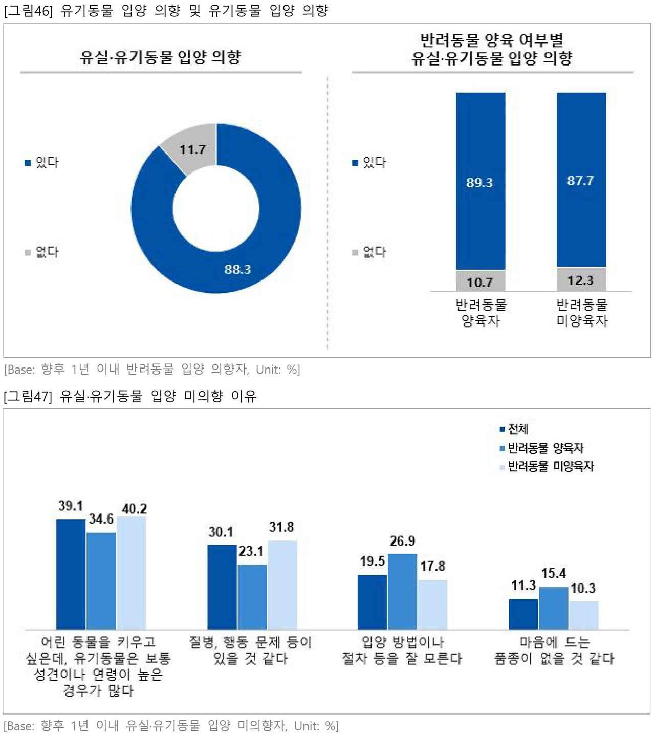 반려동물 양육자와 미양육자 모두에서 유기동물 입양 의향이 높았다(각각 89.3%, 87.7%).