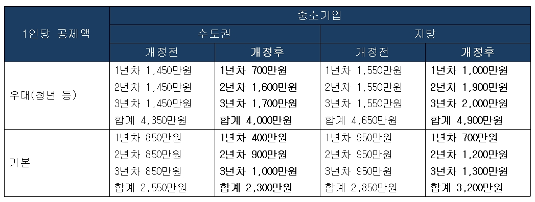 통합고용세액공제를 적용받은 과세연도의 상시근로자 수 이상으로 고용하는 경우는 더 많은 공제금액을 적용받도록 하고, 상시근로자의 수가 감소한 경우에도 공제받은 금액을 추징하지 않도록 세액공제 구조가 개편되었습니다.
