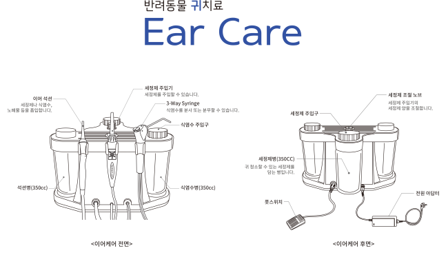 이어 케어는 세정액을 넣을 수 있는 세정액 주입기, 식염수(셀라인)를 주입과 에어까지 불어 줄 수 있는 3-Way syringe, 세정액과 식염수를 빨아낼 수 있는 이어 석션이 함께 부착되어 있는 제품이다.