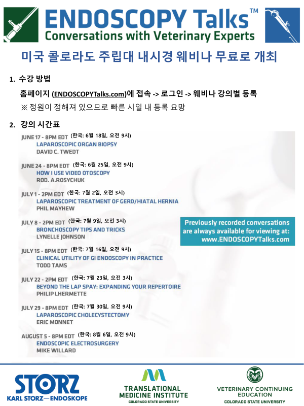 베트컴코리아가 미국 콜로라도주립대 수의과대학이 주최하는 내시경 웨비나 소식을 알렸다.