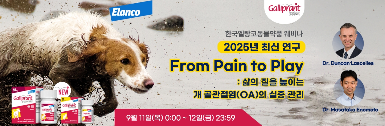 한국엘랑코동물약품이 주최한 ‘From pain to play’ 웨비나에서 세계적인 통증 관리 전문가 Duncan Lascelles 박사와 Masataka Enomoto 박사가 반려견 골관절염에 대한 최신 지견을 공유했다.