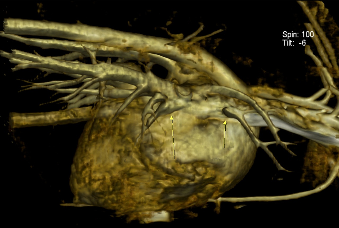 3D로 재구성한 환자의 CT 이미지. 양쪽 화살표는 비정상으로 주행하는 폐정맥을 의미한다. 우상폐정맥이 상대정맥으로 주행하며, 양측 폐정맥 사이 거리가 3cm에 달해 거리가 상당했다.