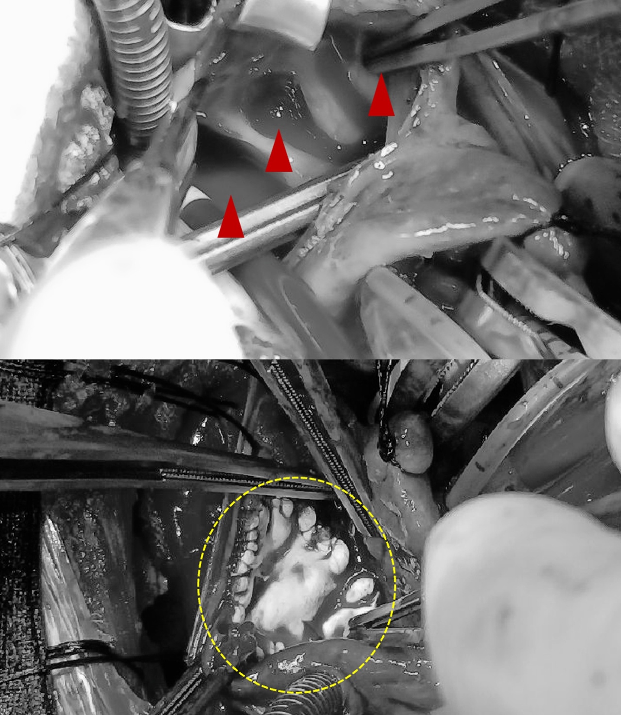 (위) 수술 장면. 왼쪽 화살표부터 ASD, 우중폐정맥 개구부, 우상폐정맥 개구부