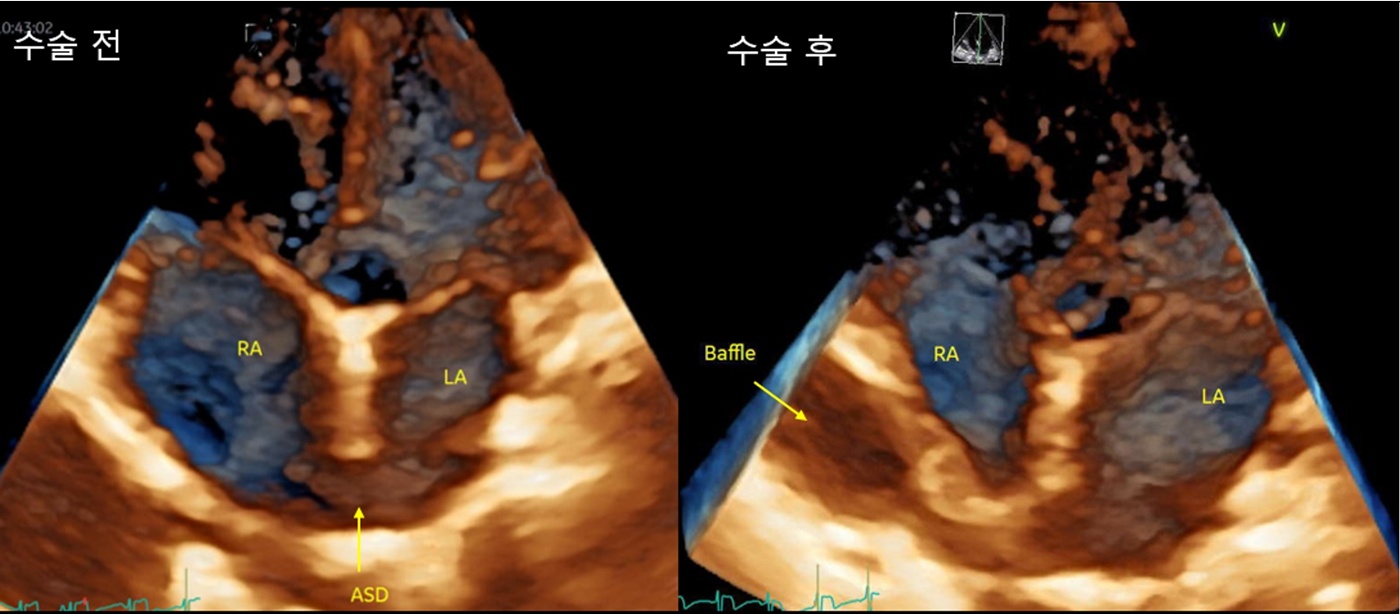 3D로 재구성한 수술 전, 수술 후 심장초음파. 폐정맥 환류 이상과 ASD를 동시에 교정하기 위해 ASD를 유지한 채 우심방 내 통로(baffle)를 재건했다.