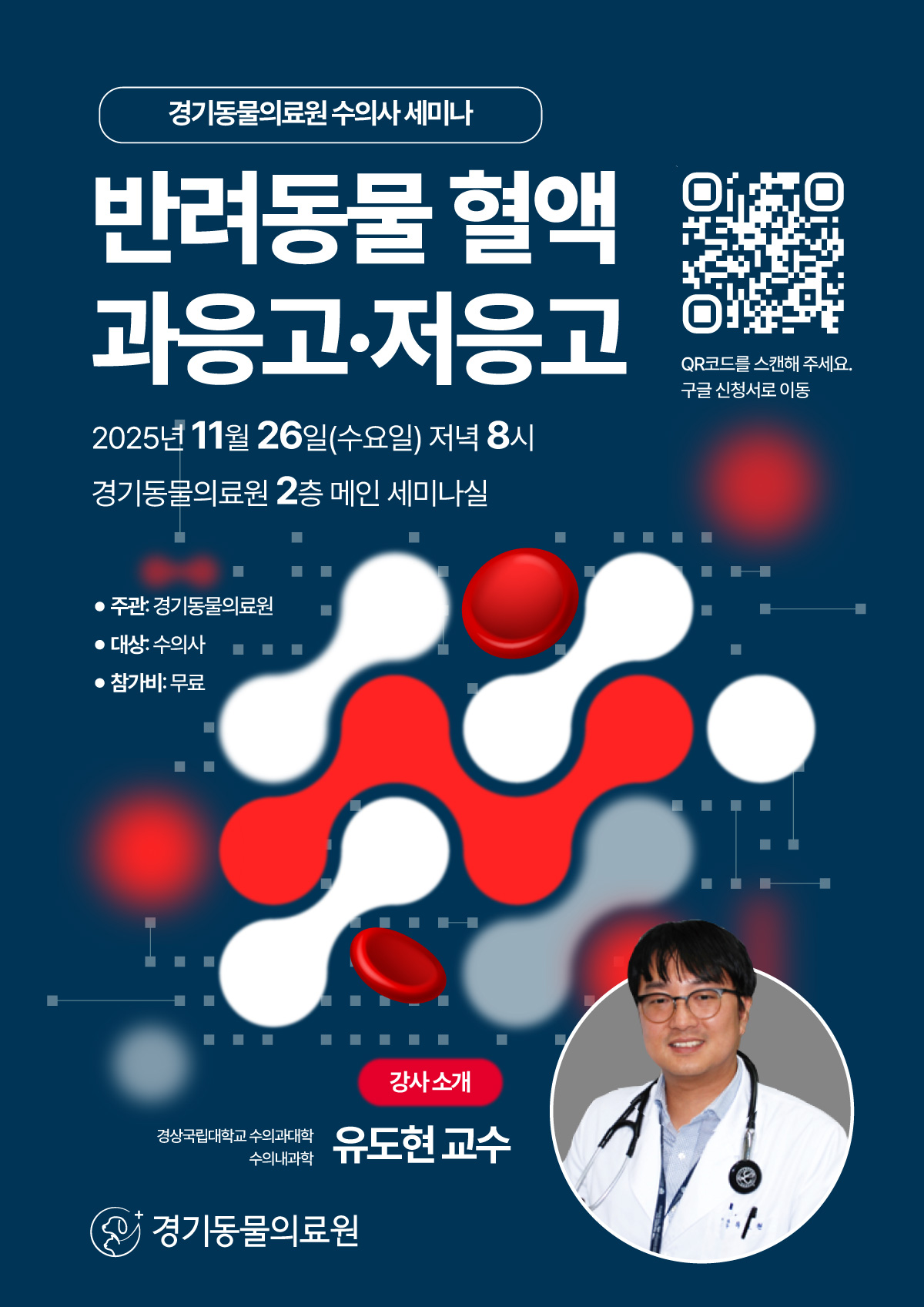 11월 26일(수) 오후 8시 경기동물의료원에서 열리는 이번 세미나는 ‘반려동물 혈액 과응고·저응고 최신 업데이트’를 주제로 진행된다.