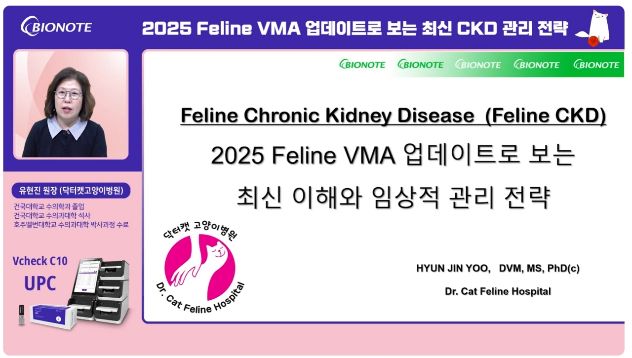 22일(토)~23일(일) 바이오노트 웨비나에서 연자로 나선 닥터캣고양이병원 유현진 원장은 올해 Feline VMA(구 AAFP) 컨퍼런스에서 접한 만성신장병(CKD) 관련 최신 연구를 소개하면서 이렇게 말했다.