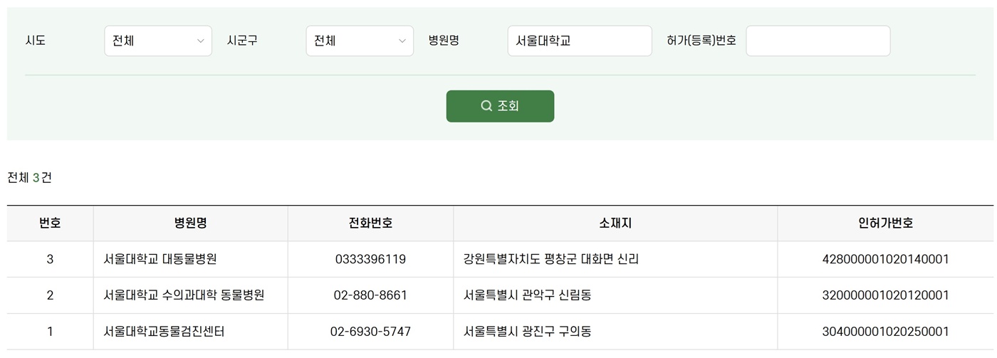 2026년 1월 현재 ‘서울대학교’ 명칭을 가진 전국 동물병원 현황(국가동물보호정보시스템)