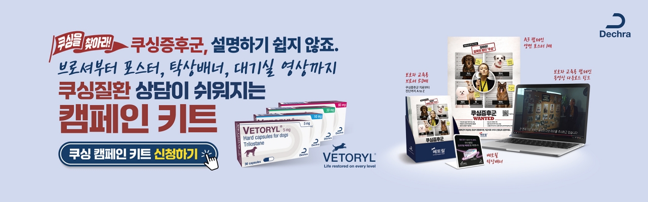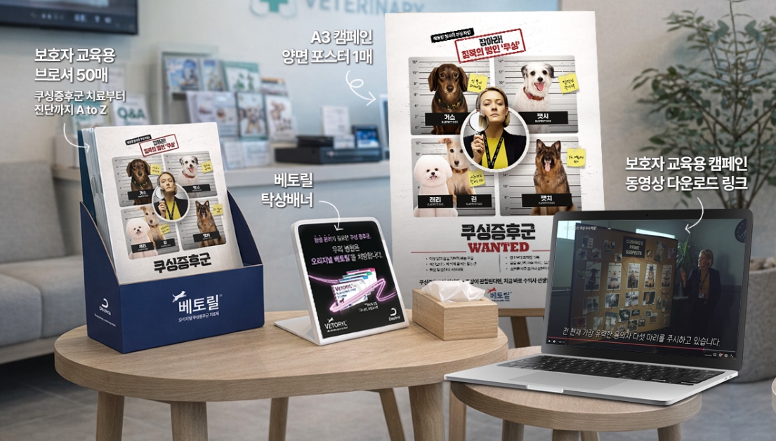 ‘쿠싱을 찾아라’ 캠페인 키트는 ▲보호자용 쿠싱증후군 브로셔 ▲대기실 포스터 ▲탁상 배너 ▲보호자 교육용 대기실 영상 등으로 구성되어 있다. 각 동물병원 환경에 맞게 선택적으로 활용할 수 있다.