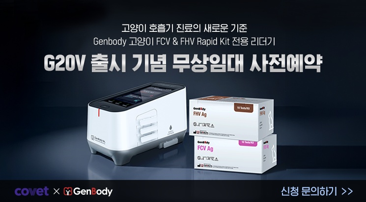 수의사 중심의 동물병원 네트워크 코벳(대표이사 오이세)이 체외진단 전문 유통 기업 AK바이오(대표 오은영)와 손잡고 젠바디(GenBody) 사의 고양이 허피스바이러스(FHV) 및 칼리시바이러스(FCV) 진단키트와 전용 판독 장비인 ‘콘피스코프 G20V(Confiscope G20V)’의 유통을 시작했다.