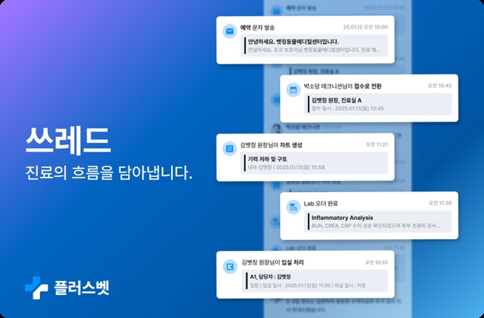 이러한 구조적 문제에 대응하기 위해 동물병원 클라우드 전자차트(EMR) 플러스벳이 환자 기록을 타임라인별로 확인할 수 있는 ‘쓰레드(Thread)’를 출시했다.