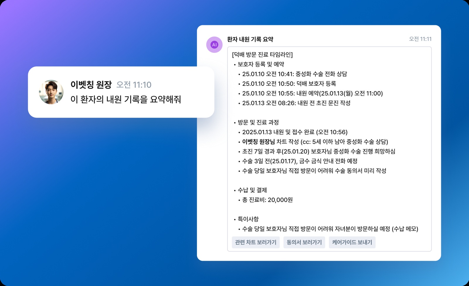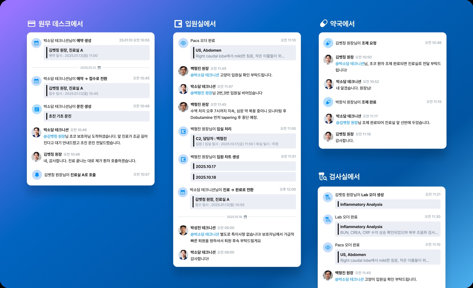 화면 상단에서 동물의 전체 이력을 확인하고, 하단에서 바로 다음 기록을 이어갈 수 있다. 접수/수납, 처치실, 진료실, 검사실의 역할은 다르지만, 모두 같은 화면에서 환자의 시간별 기록을 함께 볼 수 있다. 기존 차트에서 구두로 전달되던 정보가 시스템 안에서 실시간으로 공유된다.