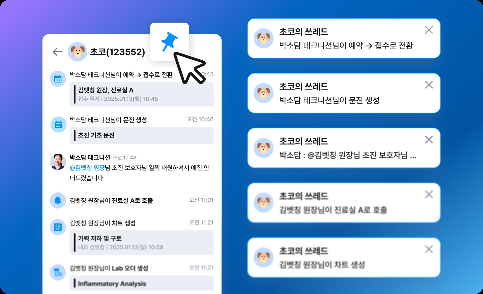 핀을 설정하면 예약, 접수 전환, 검사 완료, 입원·수납 처리 등 해당 환자와 관련된 모든 이벤트가 환자 단위로 먼저 전달된다. 기능별 알림이 아닌 환자 단위 알림으로, 담당자가 직접 화면을 열어 확인하지 않아도 중요한 흐름을 놓치지 않을 수 있다.