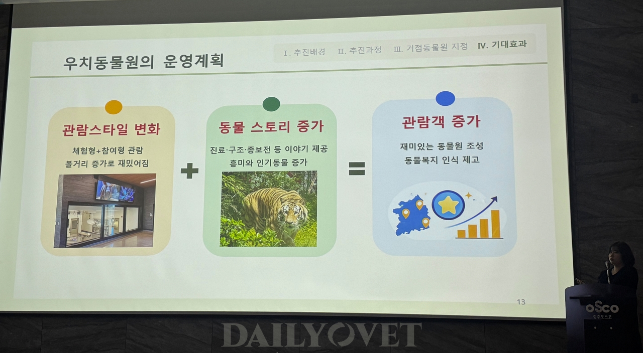 이와 관련해 우치동물원 정하진 진료팀장은 거점동물원이 되기 위해 벌였던 다양한 노력들을 소개했다. ‘일과 예산만 늘어나는 것 아니냐’는 내부의 반대 목소리를 넘기 위해 시민들의 공감을 이끌어내는데 주력했다.