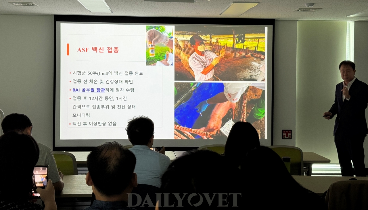 필리핀에서 진행되고 있는 야외임상시험 현황도 눈길을 끌었다. 백신접종군 50두, 대조군 50두로 구성된 임상시험의 중간 결과를 공유했다.