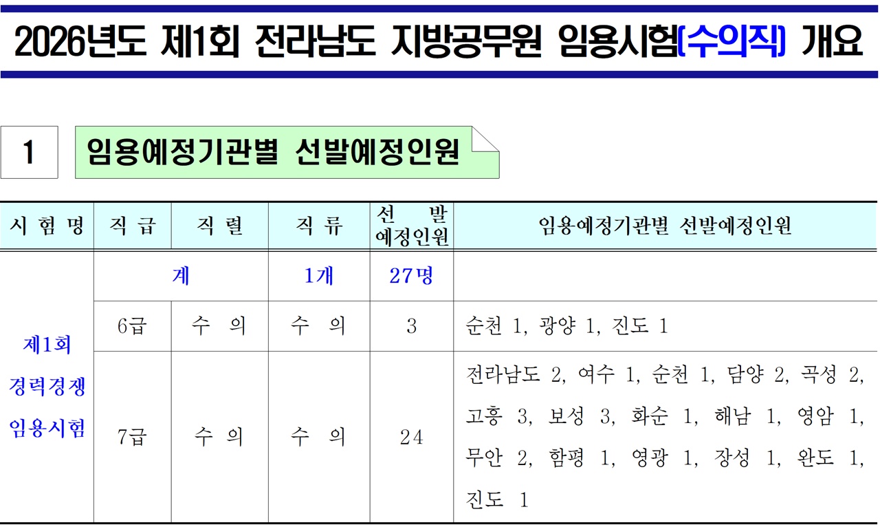 전라남도인사위원회가 2일(월) 2026년도 제1~5회 전라남도 지방공무원 임용시험 계획을 공고했다. 이 중 제1회 시험에서 수의직 공무원 27명을 채용한다. 수의 6급 3명, 수의 7급 24명이다.