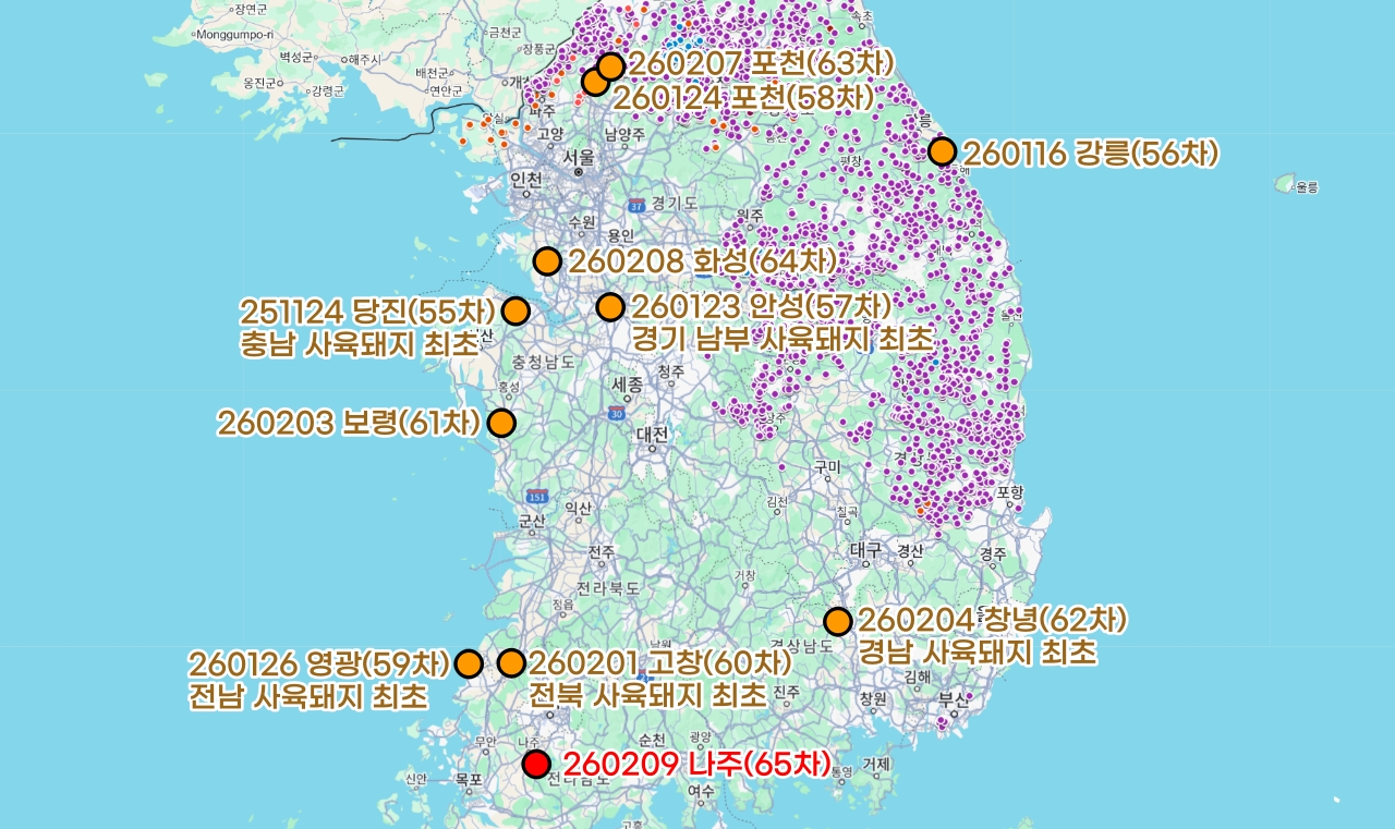 나주 발생농장까지 올해 들어 사육돼지에서 발생한 ASF는 누적 10건으로 늘었다. 1월 16일 강릉(56차)에서의 발생 이후 한 달여 만이다.