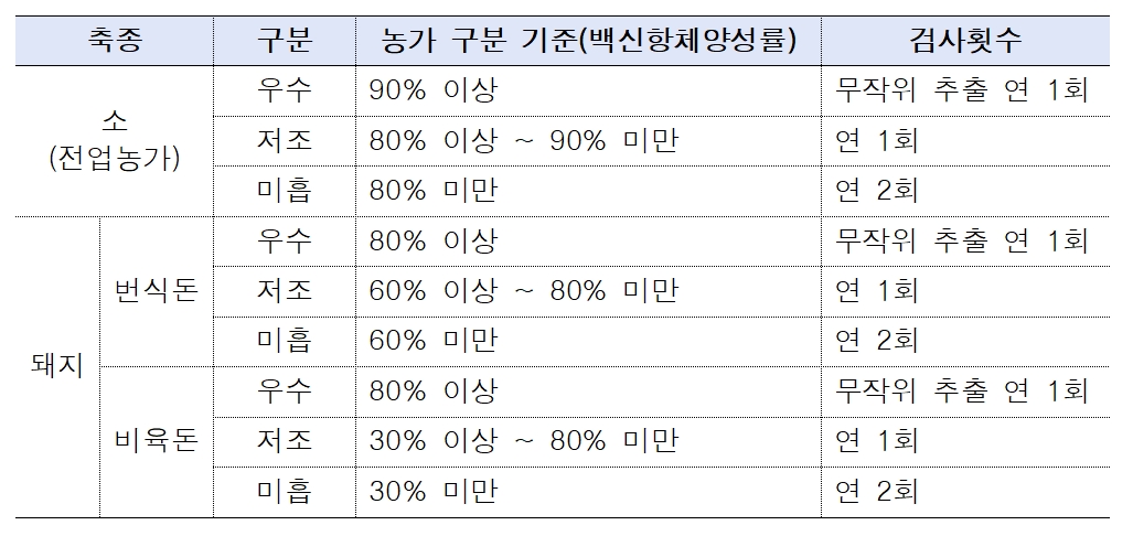항체양성률에 따라 예찰 횟수에 차등을 주는 방식은 그대로 유지된다. 최근 2년간 백신항체양성률에 따라 소·돼지 농가를 우수·저조·미흡농가로 구분한다. 우수농가는 일부만 무작위로 추출해 검사하는 반면 저조농가는 연 1회, 미흡농가는 연 2회 검사한다.