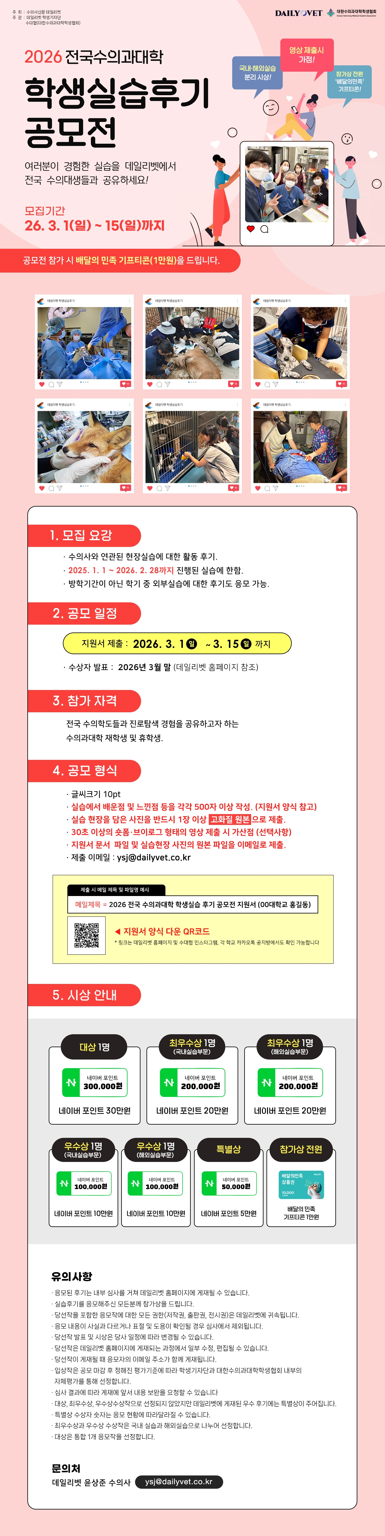 전국 수의과대학 학생들의 실습 경험을 공유하는 ‘2026 전국 수의과대학 학생 실습 후기 공모전’이 열린다.